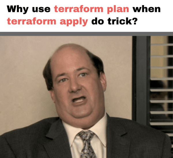 Source: /r/Terraform. AB: Locally I always run "terraform apply" and then type "sdfhsdfhrwe" if I really don't want to apply the plan I see. It saves me a few seconds a day for a few years! What are your #TerraformTricks? :)